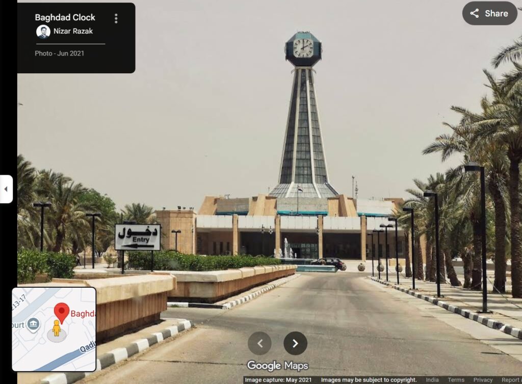 We also searched for Baghdad Clock Tower on Google Maps and located the clock tower, confirming that it is situated in the capital of Iraq.