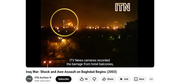 We found archived footage of the Shock and Awe operation from 2003 on the ITN Archive YouTube channel. In this video, the same tower is visible at around the 30-second mark. All of this strongly suggests that the viral video is unrelated to the Iran–Israel conflict and actually shows the 2003 US strikes on Baghdad.