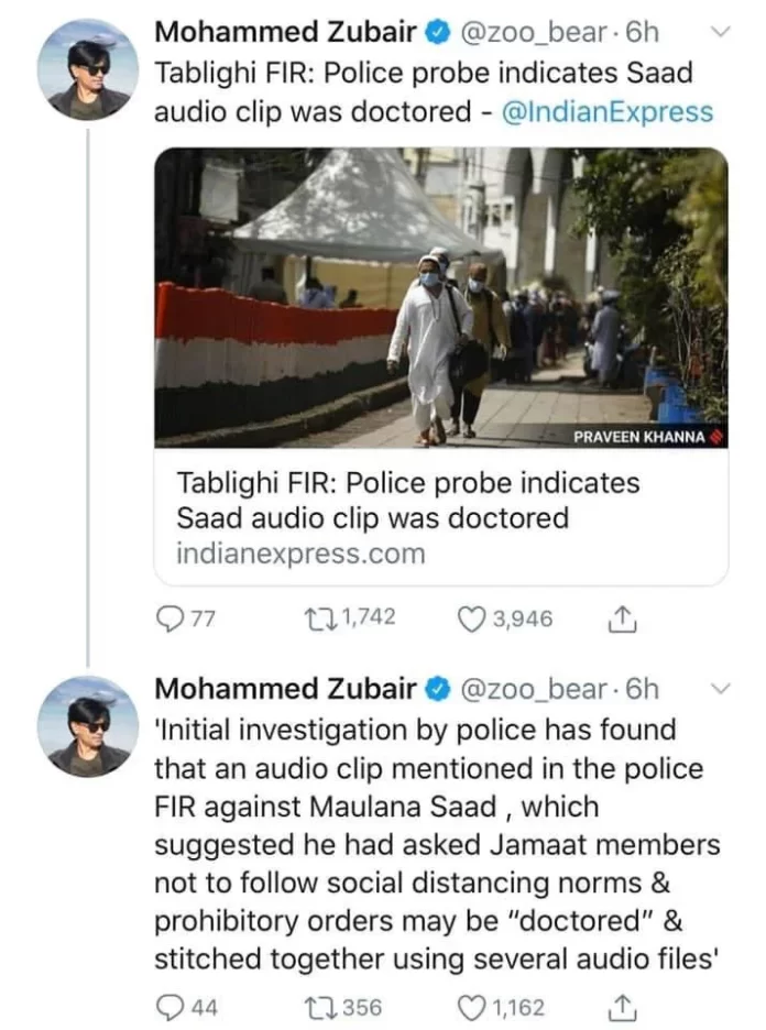 34. Viral audio of Maulana Saad Kandhalvi is not editedAn audio clip in which Tablighi Jamaat chief Maulana Saad Kandhalvi urged Muslims not to adhere to social distancing and COVID-19 guidelines is doctored. The claim turned out to be baseless and was not factually supported.