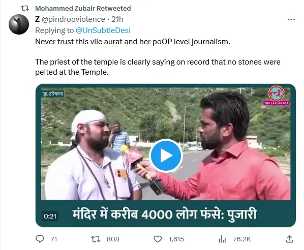 26. A video of violence is not from NuhThe video depicting Hindus with guns is from Nuh.Zubair shared a video that omitted the Muslim community’s attack on police and Hindus during a Hindu procession, only showing unidentified individuals being escorted by a gunner in self-defense.