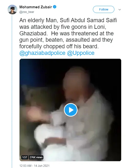 23. Muslim community people chopped beard of an elderly man, not HinduSufi Abdul Samad Saifi, an elderly man, was attacked by five goons in Loni, Ghaziabad. He was threatened at gunpoint, beaten, assaulted, and had his beard forcibly chopped off.The video claiming communal attack on an elderly Muslim man is old, which is from June 2021. There is no communal angle in this. People from his own community were involved in beating up Abdul Samad and cutting his beard.