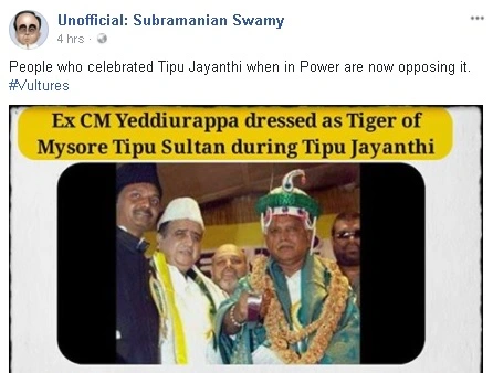 36. The picture of Yediyurappa celebrating Tipu Jayanti is misleadingYediyurappa celebrated Tipu JayantiThe picture of Yediyurappa is not of Tipu Jayanti, but of the Karnataka Janta Paksha Minority Conference in Bengaluru in 2013.