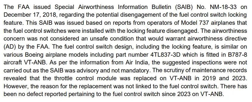 The report also mentions about the Federal Aviation Administration (FAA) advisory released on December 17, 2018, which alerted about possible issues with the fuel control switch locking features. This feature is designed to prevent RUN and CUT OFF from accidentally moving. But in Boeing 737 airplanes it was reported that many fuel control switches were installed without locking features. However, the FAA did not consider this issue a serious problem and did not take any safety measures like an Airworthiness Directive. Instead the FAA issued a Special Airworthiness Information Bulletin (SAIB) and advised that this issue be voluntarily inspected and fixed. A similar switch with part number 4TL836-3D is used in Boeing aircraft models such as the Boeing 787-8 aircraft VT-ANB. The report further states that Air India did not choose to act as per the advisory issued by SAIB.