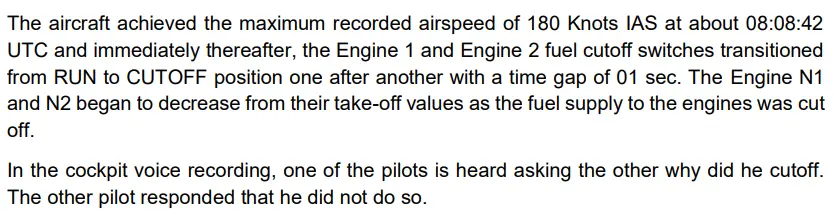 However, the next para of the report, mentions about the captured cockpit voice recording of both the pilots, where one pilot noticed that the fuel was cut off and he is heard asking the other why did he cut. To which the pilot responds that he did not do so.