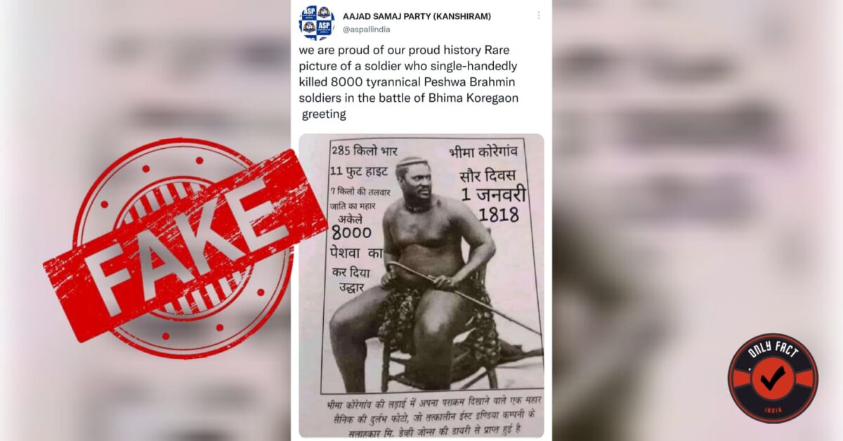 Another Twitter user uploaded an infographic claiming that an 11-foot-tall soldier weighing 285 kg killed 8,000 Peshwas in the Bhima Koregaon fight, with a caption that read, “We are proud of our proud history. Rare picture of a soldier who single handedly killed 8000 tyrannical Peshwa Brahmin soldiers in the battle of Bhima Koregaon.”
