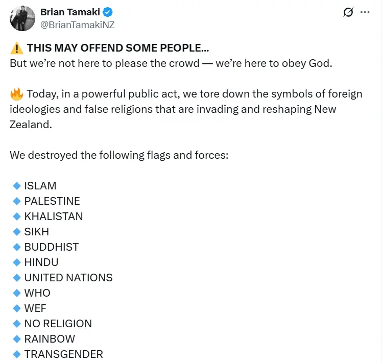 We also found another video in which the flags of many other religions and ideologies were torn down. Sharing this video, Tamaki wrote, “Today, in a powerful public act, we tore down the symbols of foreign ideologies and false religions that are invading and reshaping New Zealand.”