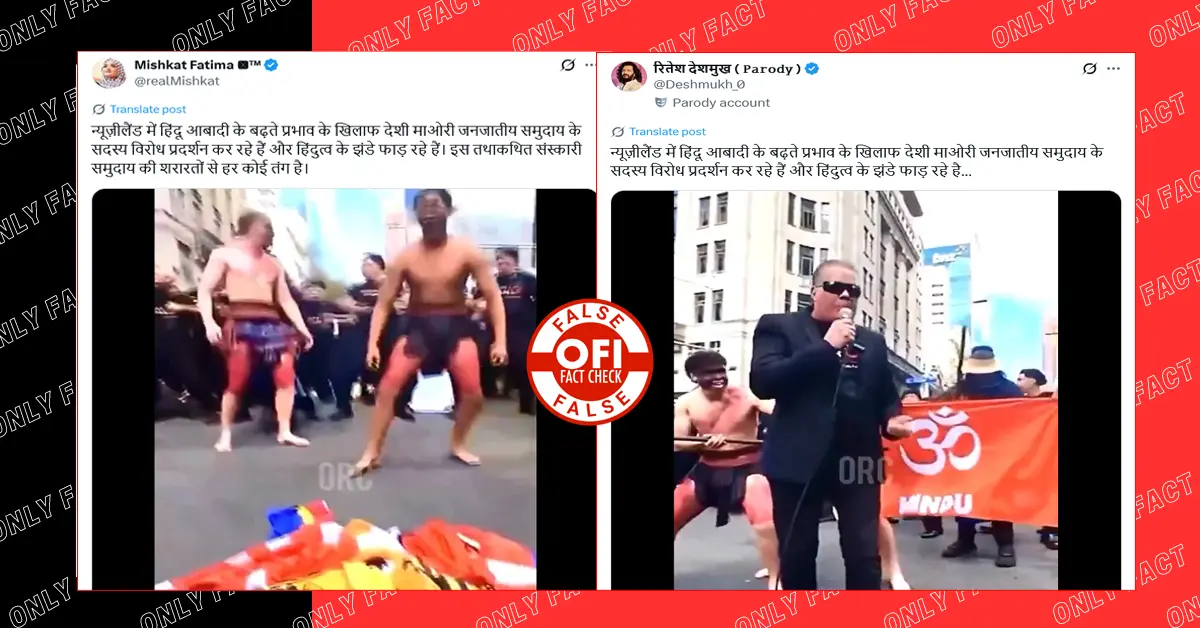 Another handle Ritest Deshmukh parody claimed, “Members of the indigenous Māori tribal community in New Zealand are protesting against the growing influence of the Hindu population and tearing down flags of Hindutva.” (archived link)