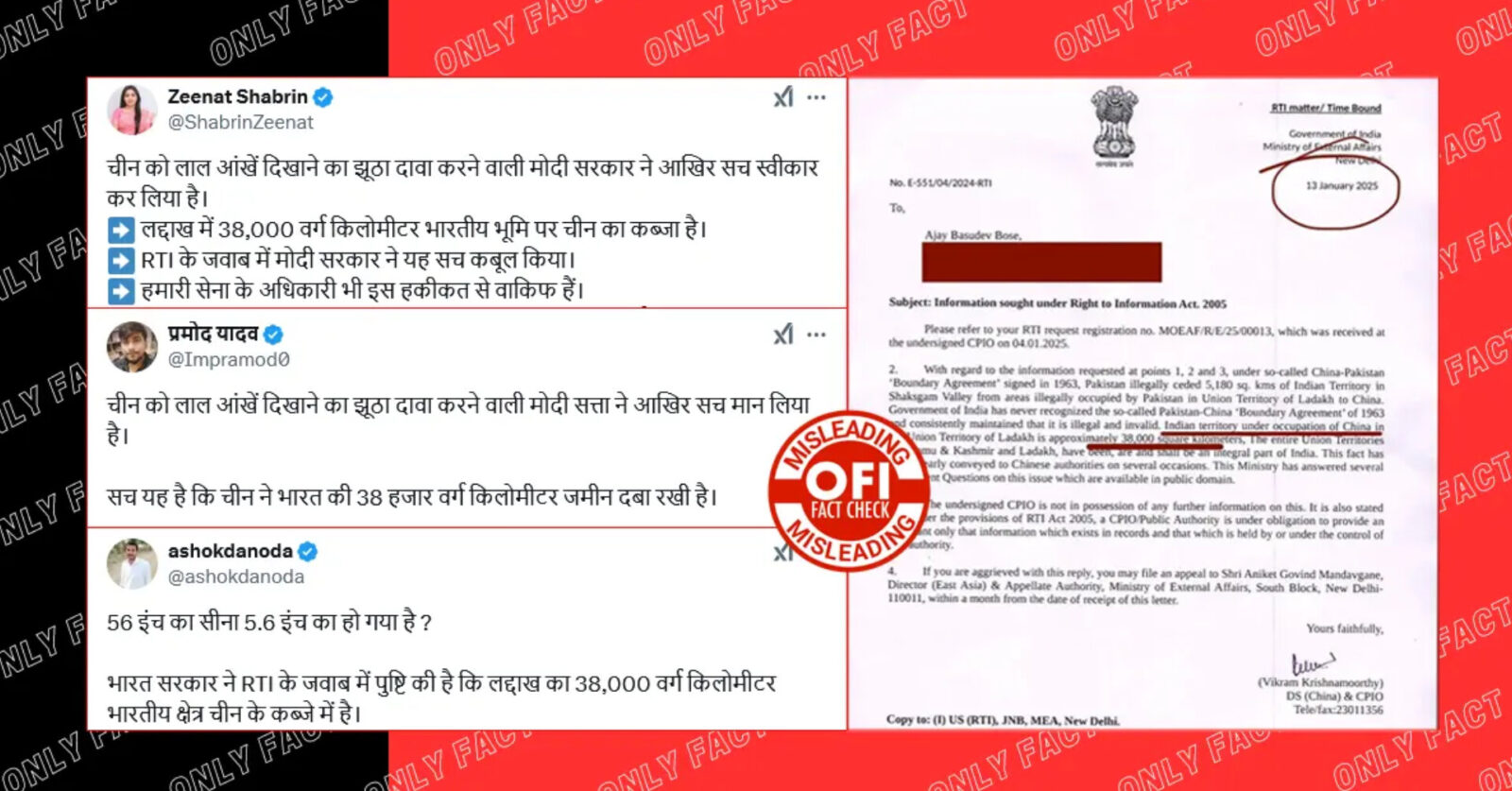 Pramod Yadav claimed that the Modi government, which falsely claimed to show red eyes to China, has finally accepted the truth. The truth is that China has occupied 38 thousand square kilometers of Indian land. In response to an RTI, the Modi government has accepted that China has occupied 38 thousand square kilometers of land in Ladakh. Not only the Modi government, even the colonels and generals of our nationalist army know this truth. But as soon as the name of China comes, the air goes out of the 56 inches. If Mohan Bhagwat is to be believed, this is the cowardly India after independence in 2024. (Archived link)