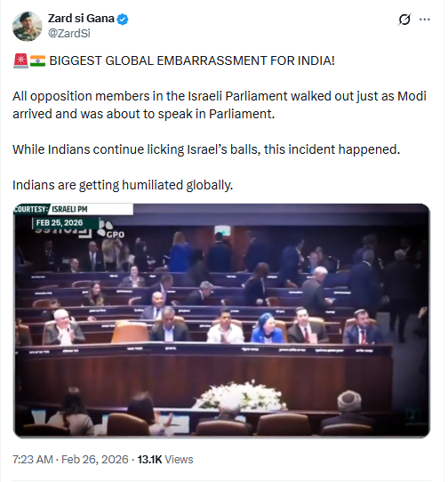 A Pakistani X handle named Zard si Gana shared the video with the caption, ‘BIGGEST GLOBAL EMBARRASSMENT FOR INDIA! All opposition members in the Israeli Parliament walked out just as Modi arrived and was about to speak in Parliament. While Indians continue licking Israel’s balls, this incident happened. Indians are getting humiliated globally.’