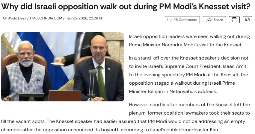 Instead, opposition leaders were reportedly upset over the exclusion of the Chief Justice of the Supreme Court of Israel, who was not invited to attend the special parliamentary session. Their protest was directed at this institutional omission rather than at PM Modi or his address. Importantly, opposition leaders also clarified that their protest was aimed at Israeli Prime Minister Benjamin Netanyahu, and not at PM Modi. They stated that the boycott was directed solely at Netanyahu and that they would return to the session for Narendra Modi’s speech.