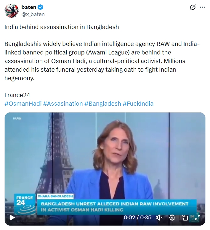 A clip purportedly from France 24 is also circulating on social media, showing the anchor attributing Osman Hadi’s killing to Indian RAW.