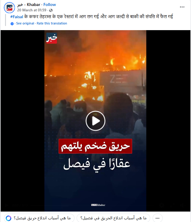 During the fact-check, keyframes were extracted from the viral video and a reverse image search was conducted. In the process, we found a similar video posted on March 20, 2026, on a Facebook page named “Khabar.” According to the post, the footage shows a fire that broke out inside a restaurant in Kafr Taharmas, Faisal, a city in Egypt.