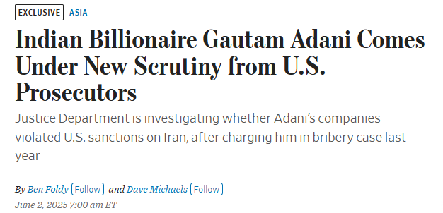 We further searched the publication for any article supporting the claim but found no evidence to substantiate it. During our investigation, we did find a June 2025 The Wall Street Journal report stating that Adani had come under fresh scrutiny from U.S. prosecutors, who were examining whether Adani-linked companies may have violated U.S. sanctions on Iran. The report indicated that authorities were examining whether Adani-linked companies may have violated U.S. sanctions on Iran. It is important to note that this referred to an ongoing investigation, not any admission of wrongdoing. The report further stated that U.S. prosecutors were looking into whether Adani-linked entities imported Iranian-origin liquefied petroleum gas (LPG) into India through Mundra port, potentially using shipping routes designed to obscure the cargo’s origin.