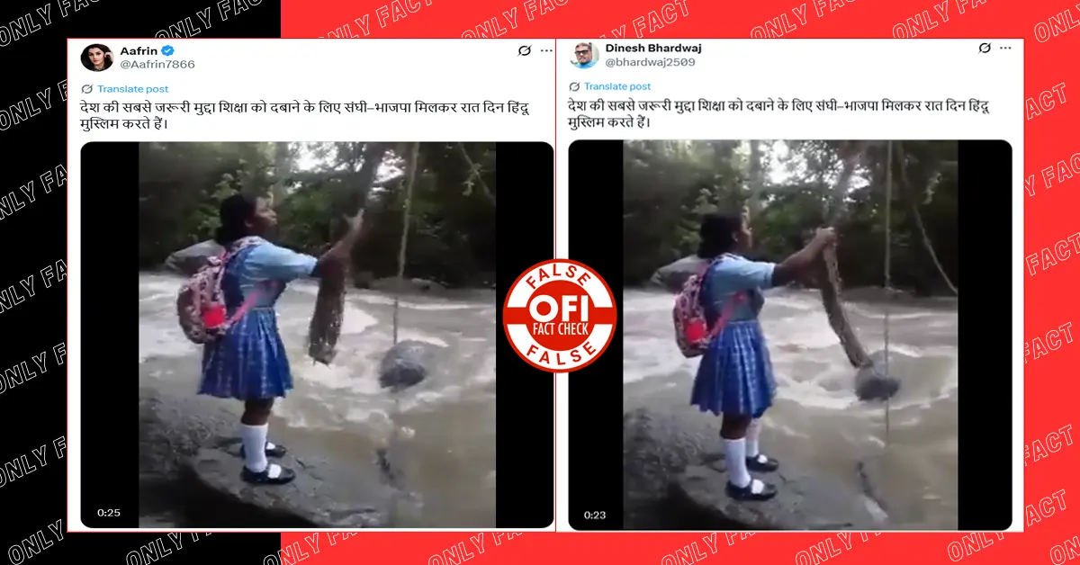 A video is going viral on social media which shows a group of school students attempting to cross an overflowing drain to navigate their way to school. Sharing this video, the handle Hansraj Meena wrote, “Votes are won by building temples, not bridges!” (archived link)