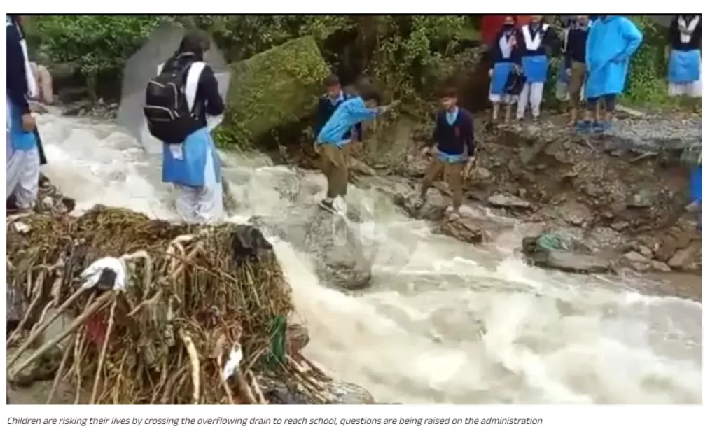 The same keyframe was also found in another report by Dainik Bhaskar dated July 20, 2023. The report states that the Soupi village was adopted under the BJP MP Adarsh Gram Yojana. Due to heavy rains in Uttarakhand, the drains were overflowing with water, forcing children to risk their lives by crossing the dangerous drain to reach school.