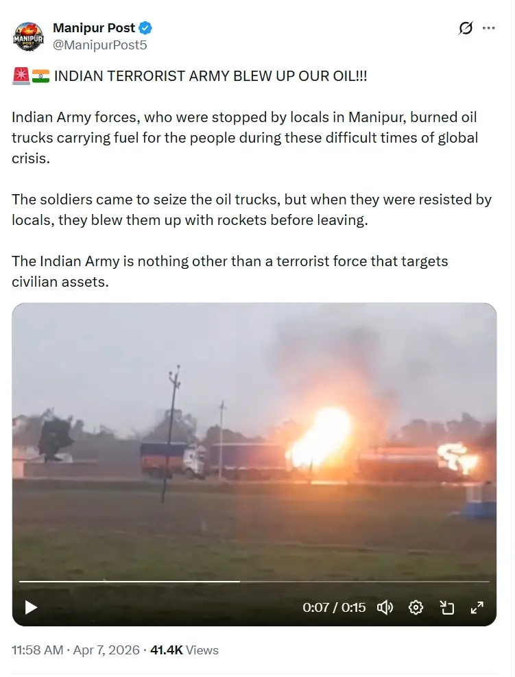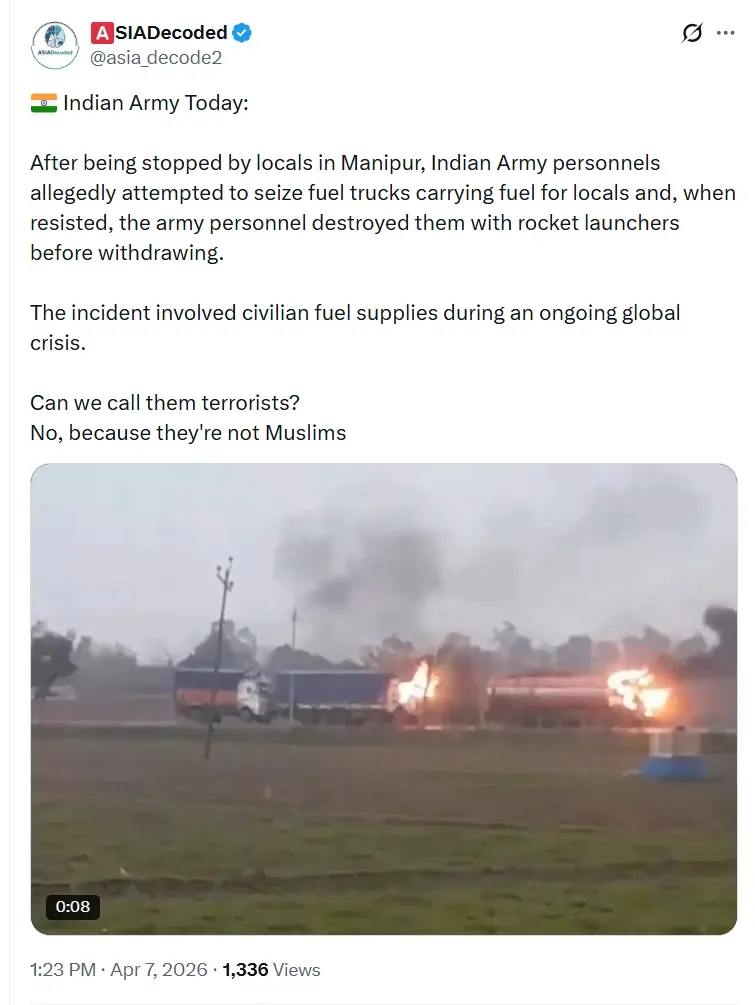 Another handle Asia Decoded claimed, ”Indian Army Today: After being stopped by locals in Manipur, Indian Army personnels allegedly attempted to seize fuel trucks carrying fuel for locals and, when resisted, the army personnel destroyed them with rocket launchers before withdrawing. The incident involved civilian fuel supplies during an ongoing global crisis. Can we call them terrorists? No, because they’re not Muslims”