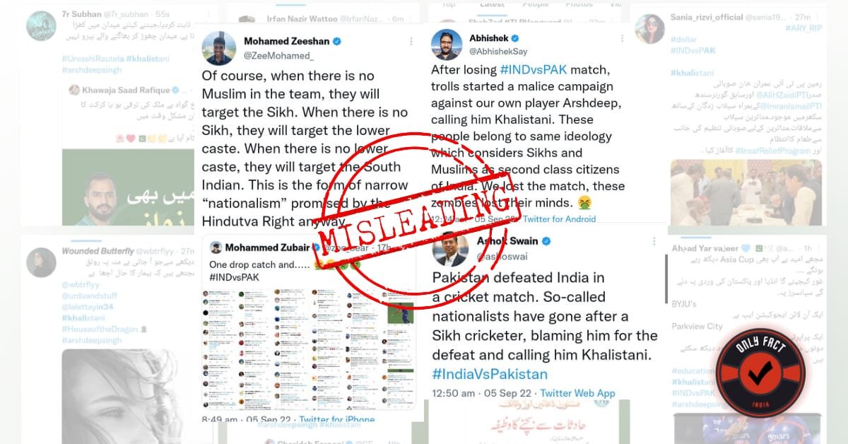 Pakistan defeated India by five wickets on September 4, 2022, in a T20 Asia Cup match played in Dubai. The defeat of the Indian Team infuriated and disappointed many Indian fans. Following Pakistan’s victory, many leftist accounts including ALT News founder Mohammed Zubair, author Mohamed Zeeshan, and ALT News journalist Abhishek mocked people belonging to Hindu ideology by selectively sharing screenshots of some Twitter users calling Arshdeep a Khalistani. These leftist accounts attempted to damage the reputation of India and claimed that the trend to call Indian cricket player Arshdeep Singh a khalistani was started by Indian right wing.