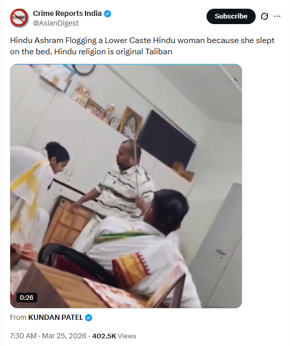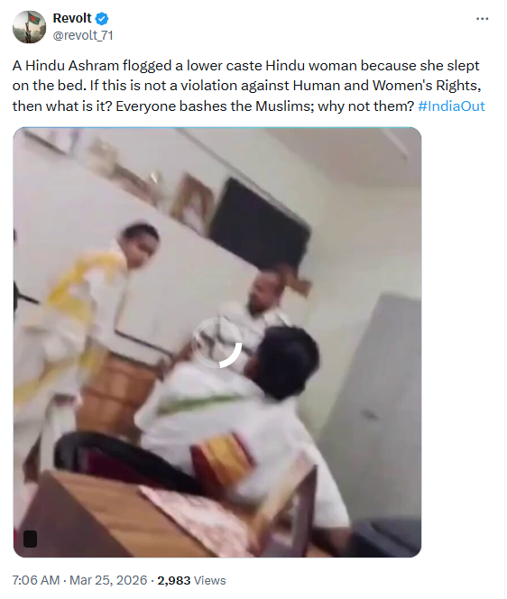 An X account named Crime Reports India shared the video with the caption “Hindu Ashram Flogging a Lower Caste Hindu woman because she slept on the bed. Hindu religion is original Taliban.”