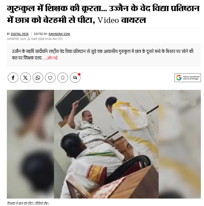 | Fact | There is no caste-based angle in the incident of a teacher beating a student in a Gurukul. The student was beaten for sleeping on another student’s bed, not because of their caste. Meanwhile, the police have registered a case against the accused teacher. |