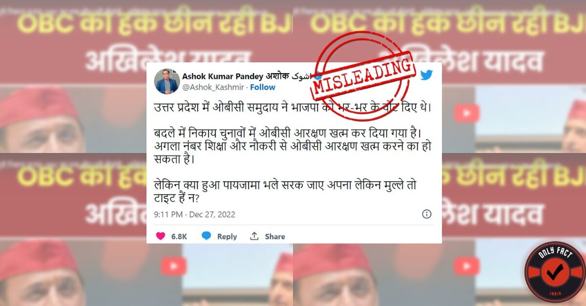 27 दिसंबर 2022 को लेखक अशोक कुमार पाण्डेय ने अपने ट्विटर हैंडल से एक ट्वीट कर दावा किया कि उत्तर-प्रदेश के OBC समुदाय के लोगों ने BJP को भर भर के वोट दिए थे बदले में, योगी सरकार द्वारा निकाय चुनावों में OBC आरक्षण को खत्म कर दिया गया है।