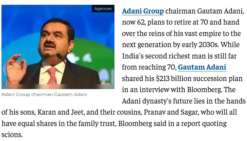 In our fact check research, we found that the succession was not an abrupt decision, but a planned one. We found a report by Economic Times dated August 7, 2024. The headline of the report reads, “Adani succession plan: The four heirs to Adani’s $213 billion empire.” According to this report, in an interview with Bloomberg dated August 5, 2024, Adani, disclosed his retirement plan and stated that he intends to retire at the age of 70 and Adani group control will gradually transit to his next generation, including his son, Karan Adani, along with Jeet and cousins Pranav and Sagar, and they all will be an equal beneficiaries in the family trust.