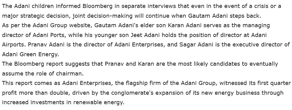 The Times of India report dated August 5, 2024, also noted the succession strategy of Adani. In an interview with Bloomberg, Adani emphasized that the control transition must be organic, gradual and very systematic. The report also noted that Karan Adani is already serving as the managing director of Adani ports, while his other son Jeet hold the position of director at Adani airports. Pranav Adani and Sagar Adani are running other group businesses.