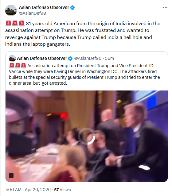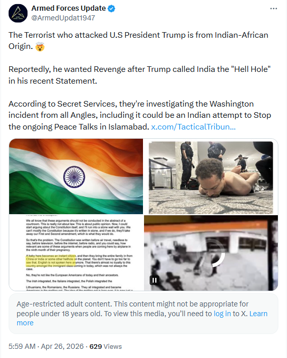 A Pakistan-based X handle, Armed Forces Update, claimed that “the terrorist who attacked U.S. President Donald Trump is from Indian-African origin” and was seeking revenge over Trump’s alleged remarks calling India a “hell hole.” The post further alleged that U.S. Secret Service was investigating the possibility of an Indian role in an attempt to disrupt ongoing peace talks in Islamabad.