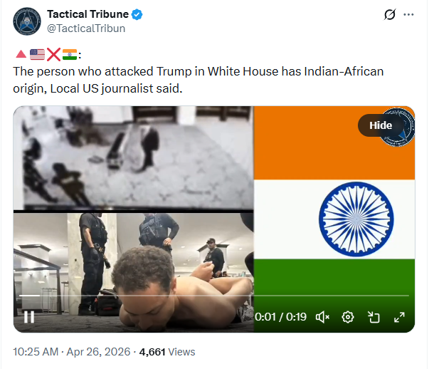 Tactical Tribune wrote, “The person who attacked Trump in White House has Indian-African origin, Local US journalist said.”