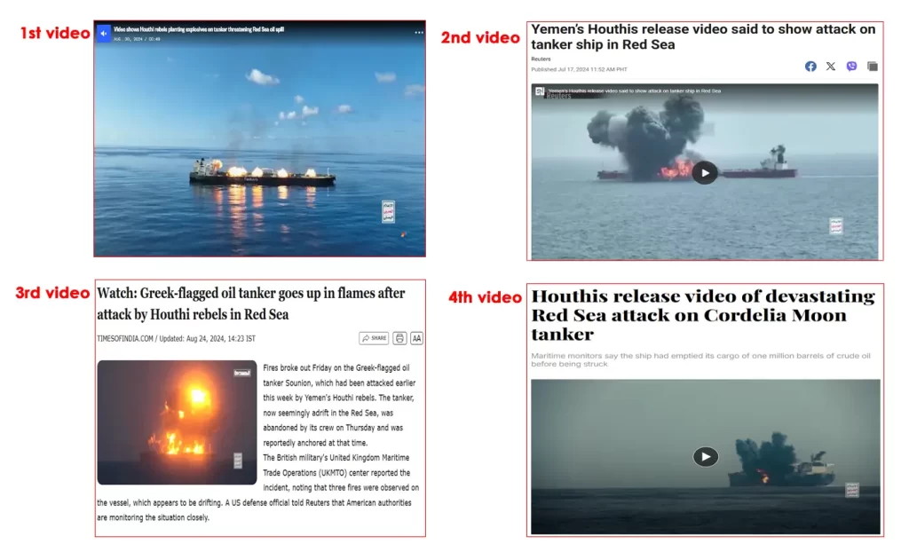 Finally, a reverse image search of the fourth video pointed us to a The National article published on October 4, 2024. The report stated that Iran-backed Houthi militants had released dramatic footage of a major attack on the oil tanker Cordelia Moon, which was hit by missiles and explosive-laden boats.