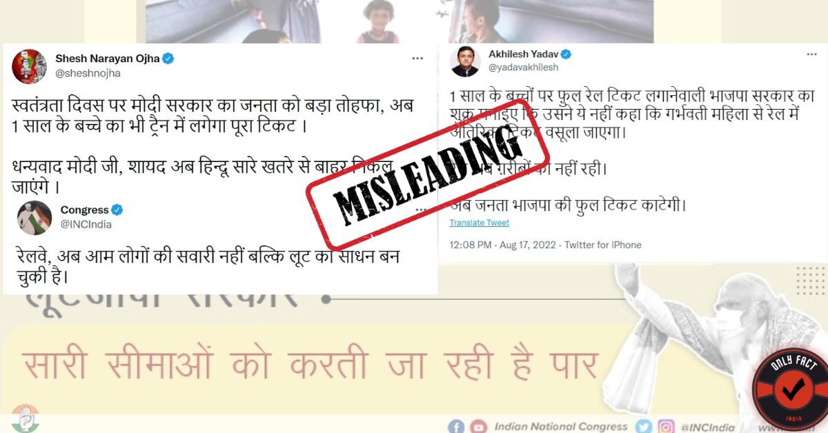 जागरण न्यूज़ का आर्टिक्ल और अखिलेश यादव , इंडियन नेशनल काँग्रेस के नेशनल सेक्रेटरी शेष नारायण ओझा , समाजवादी पार्टी उत्तरप्रदेश लखनऊ के राष्ट्रीय प्रवक्ता जितेंद्र वर्मा जीतू व अन्य ट्वीटर यूजर द्वारा किए गए ट्वीट शंकास्पद लगते ही हमारी टीमने पड़ताल की तो मालूम पड़ा की रेल्वे की जिस टिकट के बारे मे अभी चर्चा हो रही है वो ढ़ाई साल पहले किए गए बदलाव है। जिसके मुताबिक़ पांच साल से कम आयु के बच्चों की रेल्वे टिकट फ्री है पर अगर उनके नाम पर बर्थ रिज़र्वेशन किया जाता है तो फुल बर्थ की टिकट के पैसे चुकाने होंगे।
