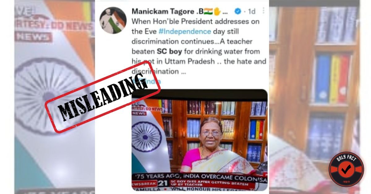 Referring to the first tribal President Draupadi Murmu’s address on the eve of the 75th anniversary of Independence Day, Congress party member Manickam Tagore claimed in a tweet on August 14 that a SC boy in Uttar Pradesh died after being beaten by a teacher for drinking water from his pot.