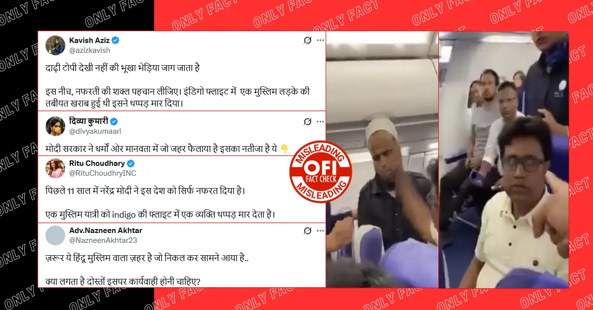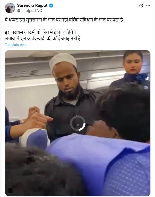A video is rapidly going viral on social media, showing visuals from abroad an Indigo flight where a passenger can be seen slapping another passenger wearing a skull cap, who is a Muslim. The cabin crew intervenes to help the Muslim passenger and says that the other passenger should not have raised his hand on him. Meanwhile, a fellow passenger questions the accused man, saying that everyone was having a problem, so why did he slap the man? To this, he replies that he was having a problem. As soon as this video went viral, this incident is being given a communal color on social media. It is being said that the person who slapped the Muslim passenger is a Hindu and he raised his hand on him because of victim’s religion.