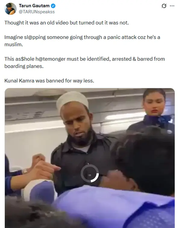 Tarun Gautam wrote, “Thought it was an old video but turned out it was not. Imagine slpping someone going through a panic attack coz he’s a muslim. This hatemonger must be identified, arrested & barred from boarding planes. Kunal Kamra was banned for way less.” (archived link)
