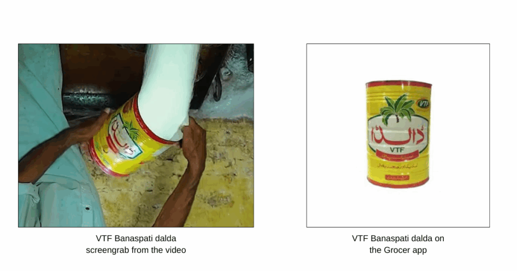 Additionally, a reverse image search led us to a Grocer App website where we found the same container with the same logo as in the video. Grocer App is a delivery service in Pakistan, similar to Blinkit and Zepto in India, and the same Dalda product is available there.