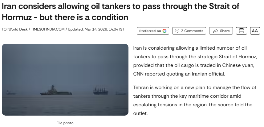 Allegedly, today, an Indian oil tanker paid Iran in Chinese yuan to pass through the Strait of Hormuz. pic.twitter.com/QIApNjN8Sd