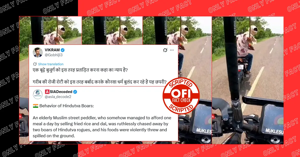Sharing the video, the handle Asia Decoded wrote, ”Behavior of Hindutva Boars: An elderly Muslim street peddler, who somehow managed to afford one meal a day by selling fried rice and dal, was ruthlessly chased away by two boars of Hindutva rogues, and his foods were violently threw and spilled on the ground.”