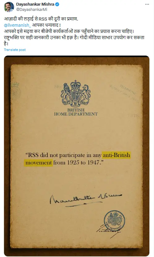 Dayashankar Mishra wrote, “Proof of RSS’s distance from the freedom struggle.” (Archived link)