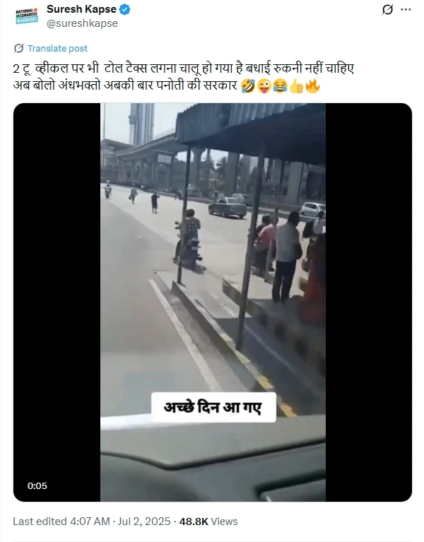 Congress Supporter Suresh Kapse on X shared this video with the claim, ‘Toll tax has now started on two-wheelers too. Congratulations, the suffering should never stop!